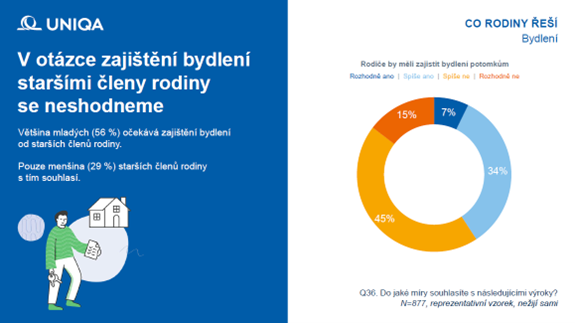 Rozmanité zkušenosti mladých lidí s bydlením doplňuje i to, jak odlišně různé generace chápou spojení rodiny a finanční podpory. Podle rozsáhlého průzkumu pocitu bezpečí v rodinách, který společně připravil finanční dům UNIQA a agentura NMS, si 56 procent mladých lidí do 35 let myslí, že by rodiče měli potomkům zajistit bydlení, například formou pomoci s koupí bytu nebo přenecháním nemovitosti.
